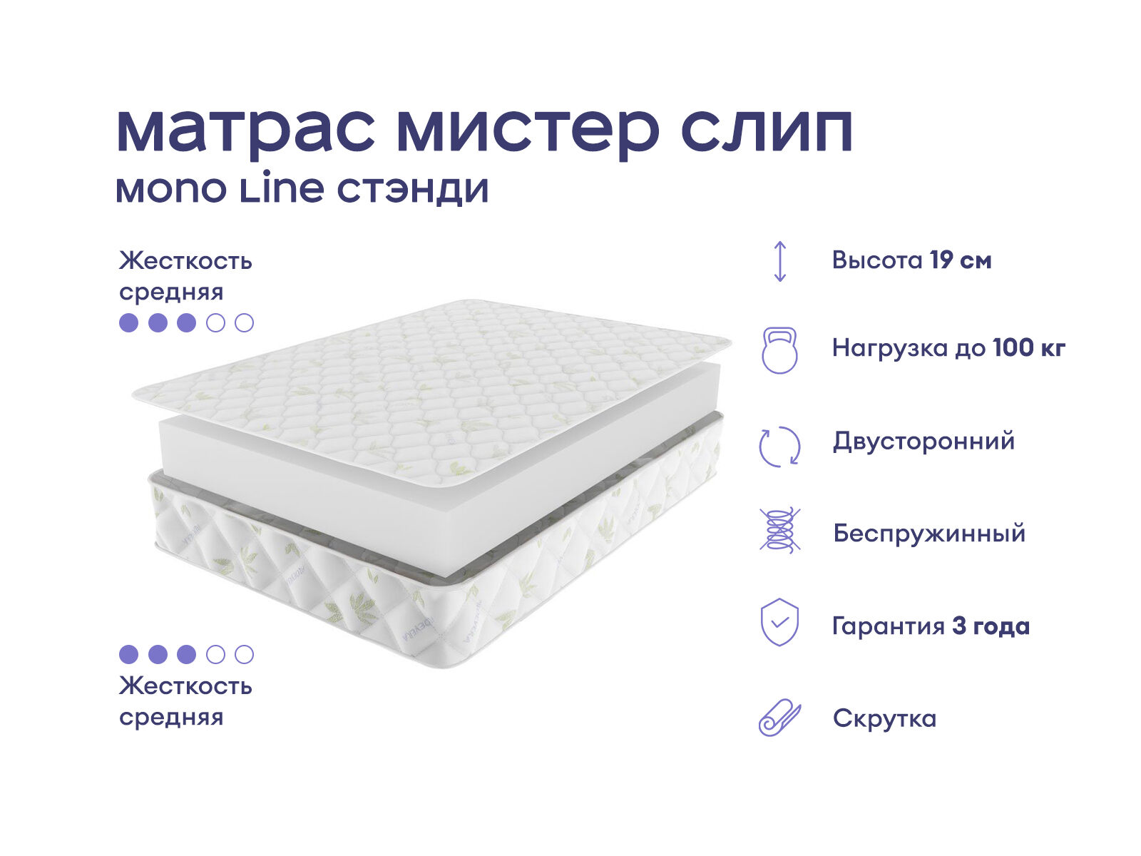 Удобный матрас-моноблок с оптимальной поддержкой. Это базовая беспружинная модель с отличными ортопедическими характеристиками. Средняя жёсткость, две спальные поверхности и качественная ортопедическая пена делают его универсальным выбором для комфортного и практичного сна.