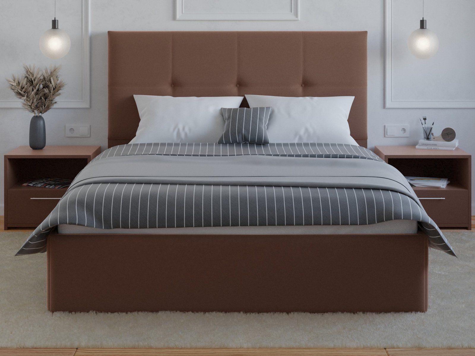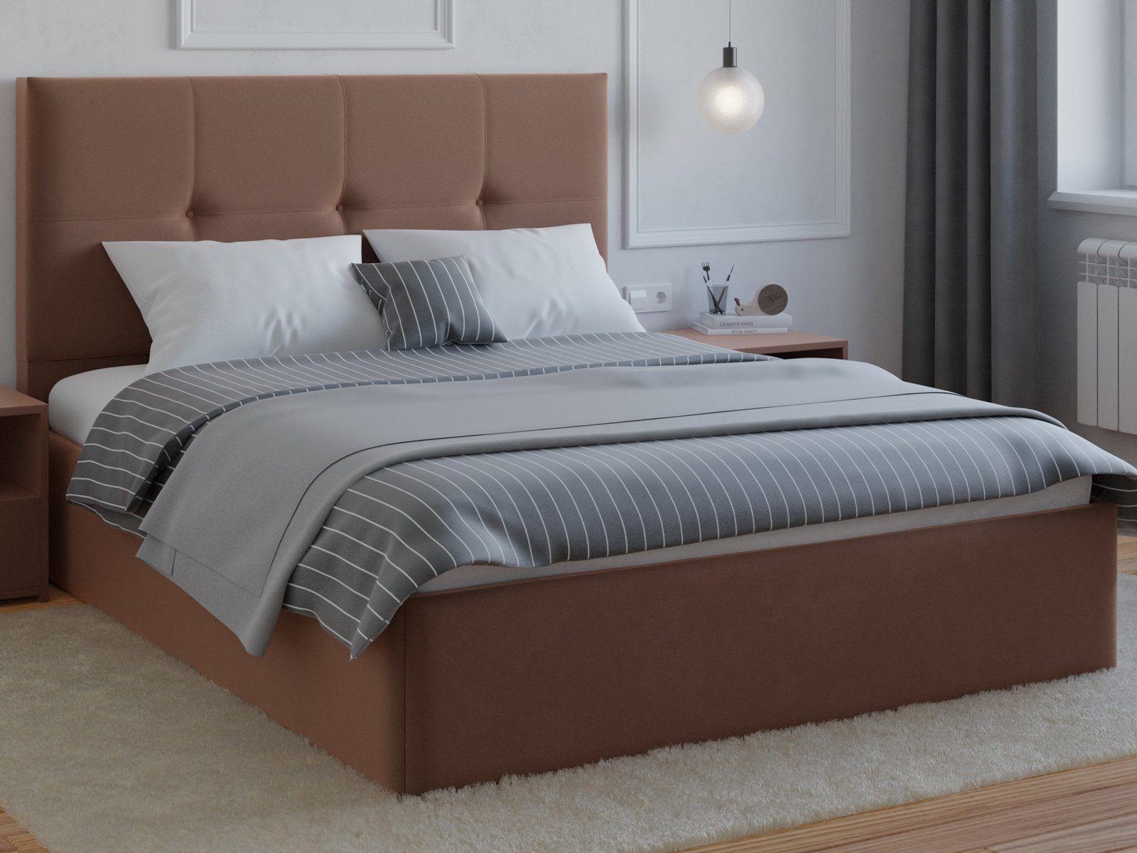 Мягкая кровать с обивкой из велюра.