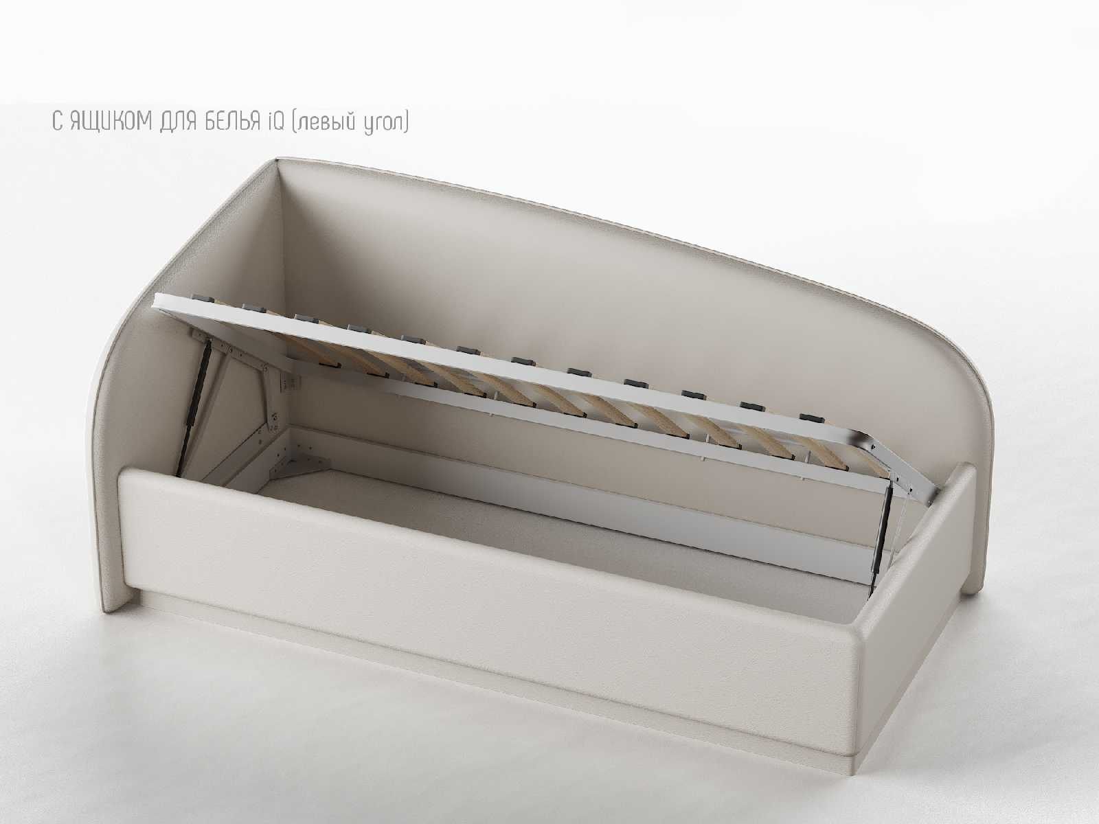 Кровать укомплектована IQ с подъемным механизмом и ящиком для белья без дна (дополнительная платная опция - дно к ящику IQ из HDF (ХДФ). Каркас кровати на цоколе, декоративный чехол на цоколе съёмный. Глубина ящика для белья - 30 см, без ограничения нагрузки на ящик.