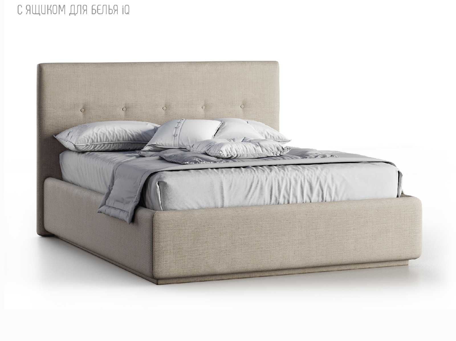 Кровать укомплектована IQ с подъемным механизмом и ящиком для белья без дна (дополнительная платная опция - дно к ящику IQ из HDF (ХДФ). Каркас кровати на цоколе, декоративный чехол на цоколе съёмный. Глубина ящика для белья - 30 см, без ограничения нагрузки на ящик.