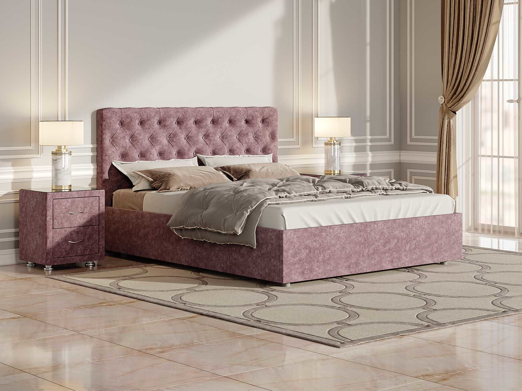 Элегантная интерьерная кровать с изголовьем, украшенным декоративными пуговицами и глубокой пиковкой. Модель изготовлена из ДСП.
