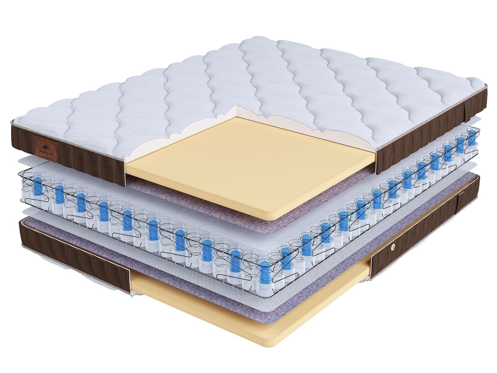 Хлопковая трикотажная ткань чехла обеспечивает комфорт и обладает отличной воздухопроницаемостью. Высокообъемная стежка с использованием холлофайбера (600гр.) подарит дополнительный комфорт спальному месту. Изысканный бурлет из мягкого велюра красивого бежевого цвета придает матрасу роскошный внешний вид и подчеркивает его премиальный статус. Каждая модель серии LIFE украшена фирменной кожаной биркой BeautySon, подтверждающая исключительность каждого матраса.
