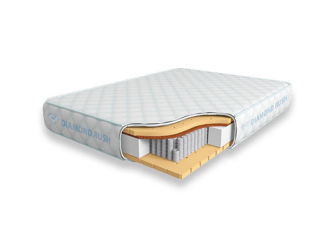 Матрас Diamond Rush Comfy Contrast 1440DR имеет в своей основе независимый пружинный блок 1440, состоящий из пружин диаметром 3-4 см. В качестве настилочных слоев поверх пружинного блока используются листовой натуральный латекс с перфорацией и латексированная кокосовая койра. Стороны матраса различаются по жесткости. Одна сторона мягкая, другая среднежесткая.
