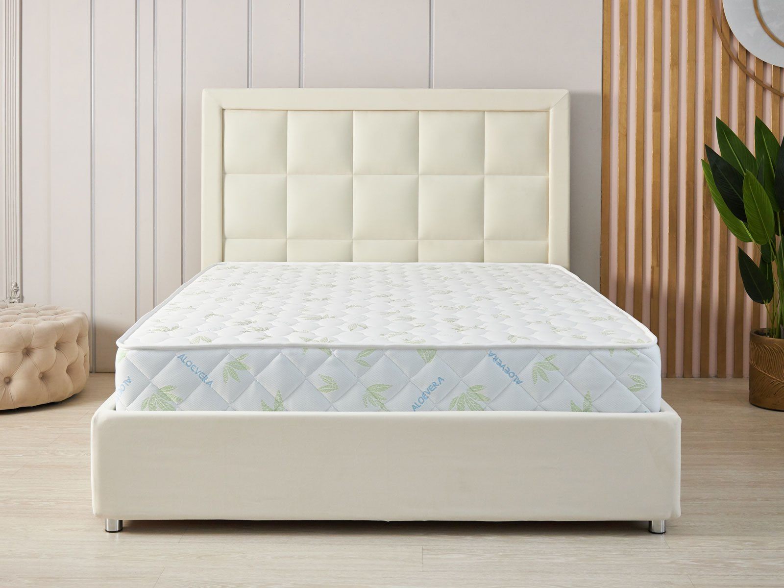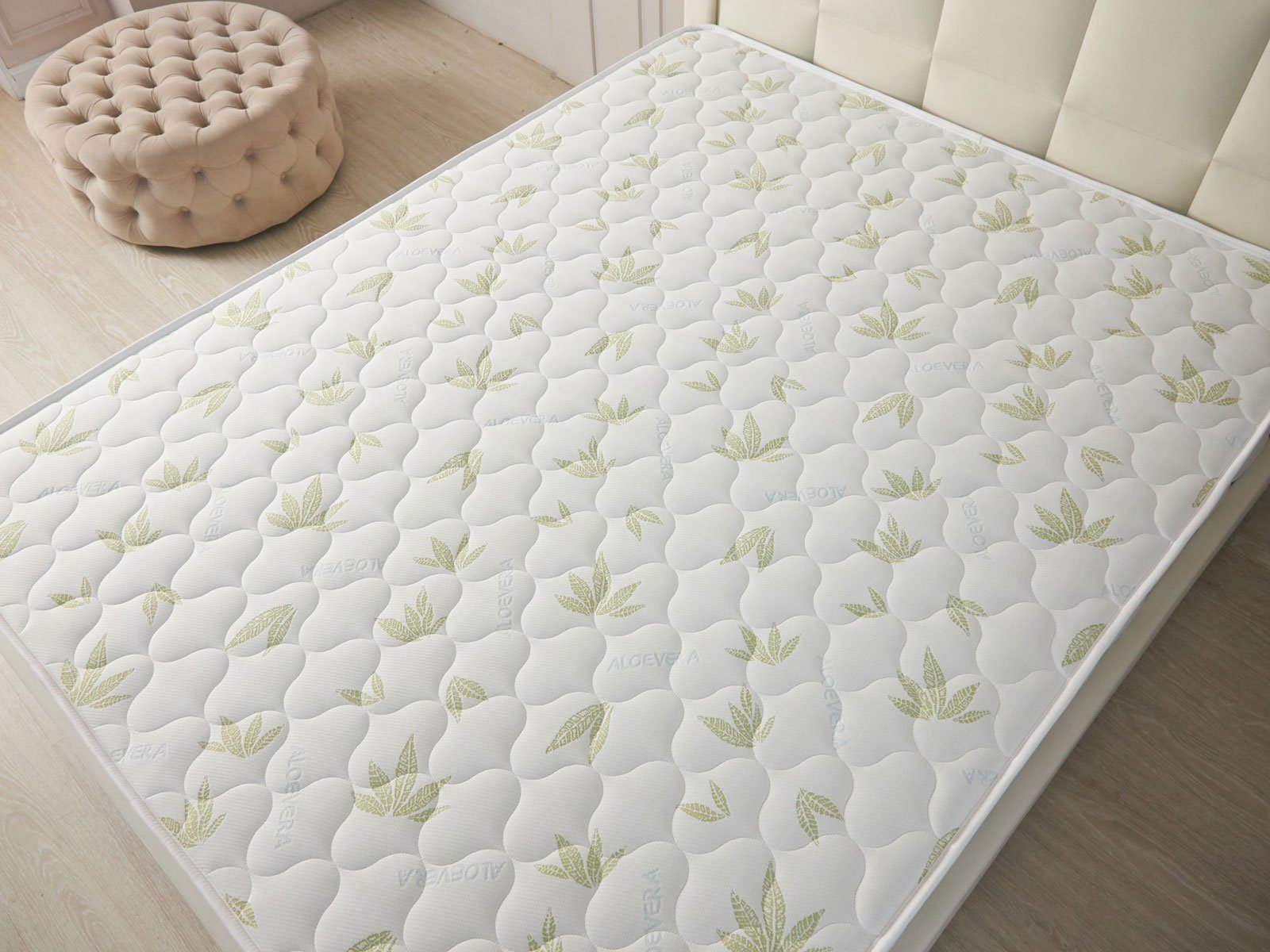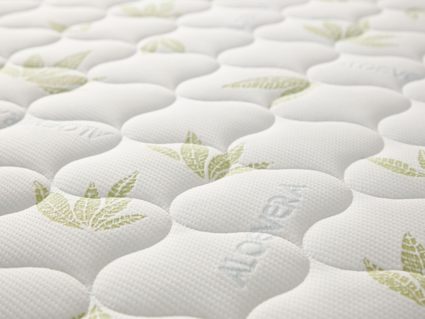Матрас изготовлен в несъёмной обивке из трикотажа «Алое». Ткань простёгивается вместе с 200 гр синтепона, поэтому поверхности имеют мягкий и приятный к телу рельеф.