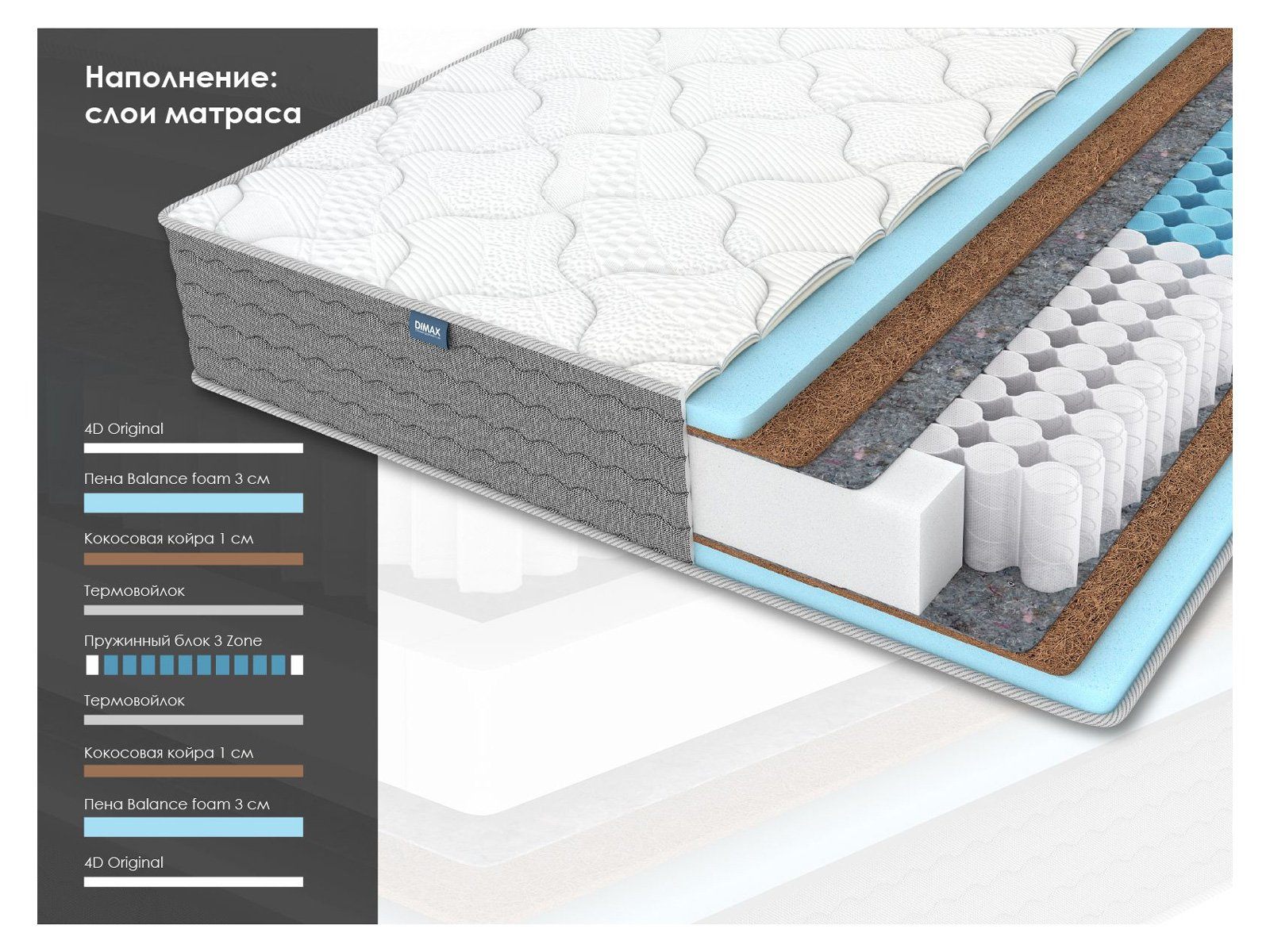 Матрас сочетает в себе натуральные и синтетические наполнители для сбалансированной жёсткости, поддерживает правильную осанку за счёт пружинной системы 3 Zone и добавляет мягкости и комфорта благодаря обивке 4D Original.