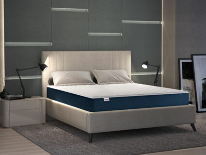 Своим стильным обликом матрас обязан необычному дизайнерскому чехлу. Обивка выполнена в двуцветной гамме, где бурлет получил глубокий синий цвет, а спальные поверхности сшиты из мягкого кремового трикотажа.