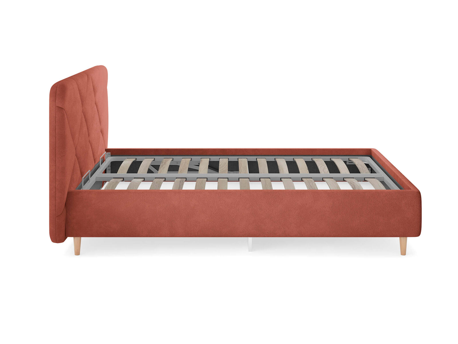 Основание кровати на деревянных ножках. Благодаря увеличенной высоте позволяют осуществлять легкую уборку под кроватью, даже с помощью робота-пылесоса.